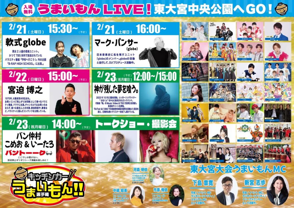 2/20~23 東大宮中央公園でのイベント 会員へのお知らせ 2026.01.142026.01.25 東大宮商工会などが毎年開催している「東大宮駅前イルミネーション」のファイナルイベントとして、「キッチンカー うまいもの選手権」が下記の日程で開催されます。ステージイベントもあります。地域活性化を目的としたイベントです。 出演者情報などはこちら